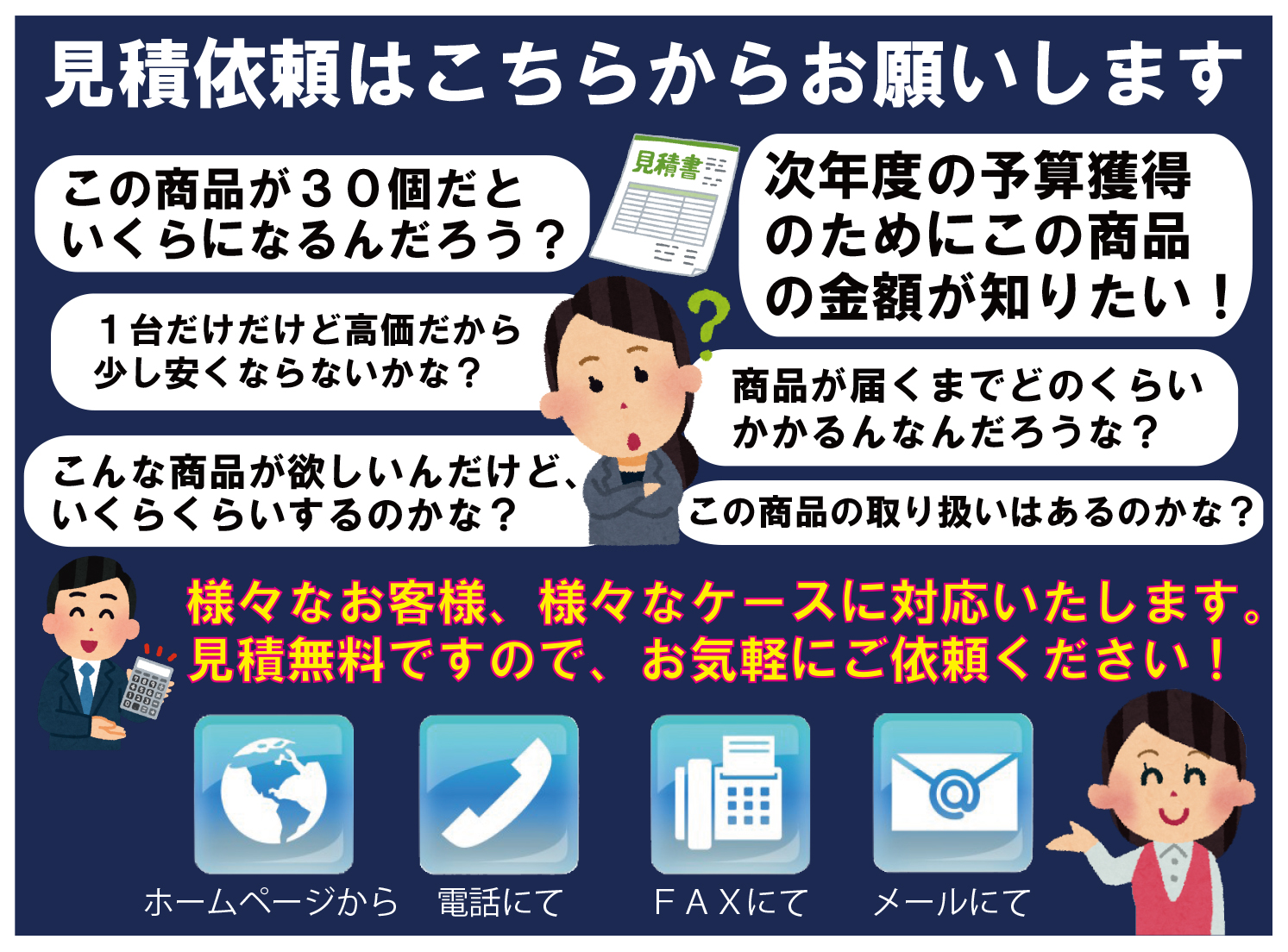 電話・FAX・E-mailからの見積依頼 TEL 0241-27-4165(営業日の9:00~18:30) FAX 0241-27-4019(24時間受付) E-mail igabun@gmail.com(24時間受付) インターネットからの見積依頼 *は必須項目です。 見積依頼内容*(品名/品番/数量/納期等のご記入をお願いいたします) 会社名/学校名/官公庁名 部署名等 お名前(漢字)* E-mail * ご連絡先(半角)* FAX番号(半角)